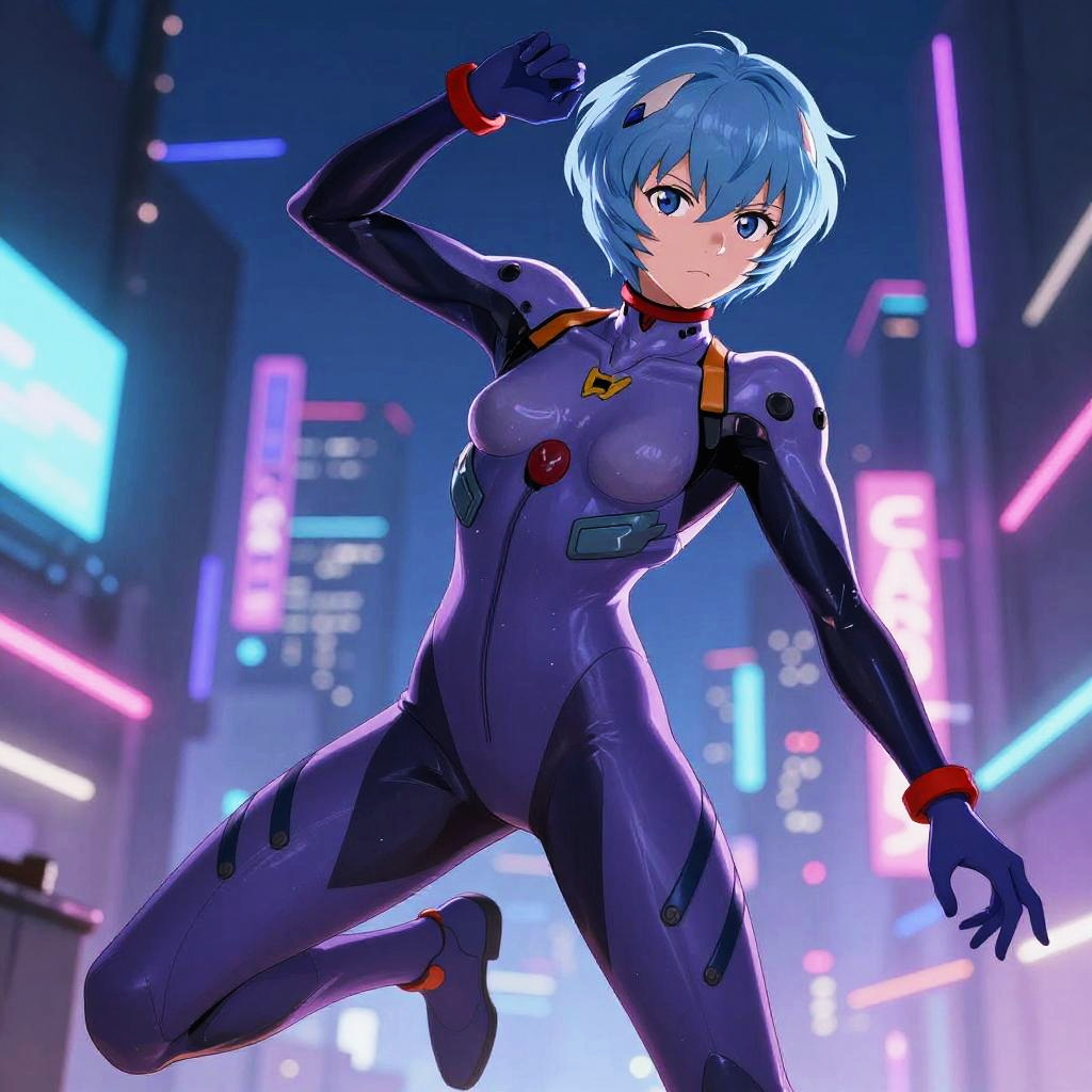 Police girl anime standing confidently on rooftop at dusk, short blue hair, holding high-tech baton, illuminated city skyline behind, vibrant colors, detailed manga-inspired art style