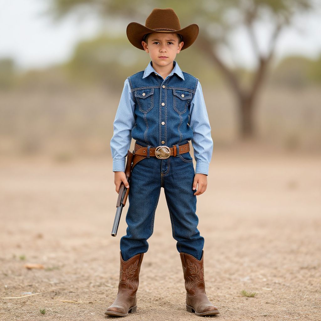Photograph of a young boy standing in a dry, dusty outdoor setting. He has light brown skin, dark brown eyes, and short black hair. He's wearing a brown cowboy hat, light blue button-up shirt, blue denim vest with pockets, and matching blue jeans. His brown leather belt has a large, ornate silver buckle. He's also wearing brown cowboy boots and holding a small silver revolver in his right hand. The background is blurred with tall trees and a pale sky, emphasizing the boy as the focal point. The overall style is realistic and vibrant, capturing a classic Western-inspired look.