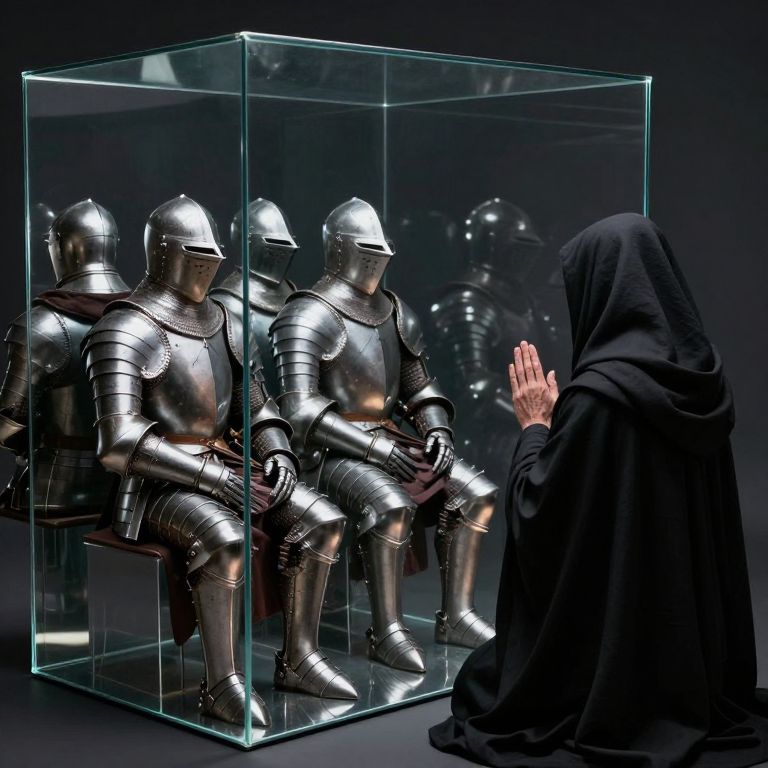 Ancient knights clad in gleaming armor sit solemnly within a mirrored cube, their reflections multiplied endlessly as they confront a cloaked figure draped in dark robes, hands clasped in prayer-like gesture, creating an enigmatic tableau of medieval mystery and introspection.