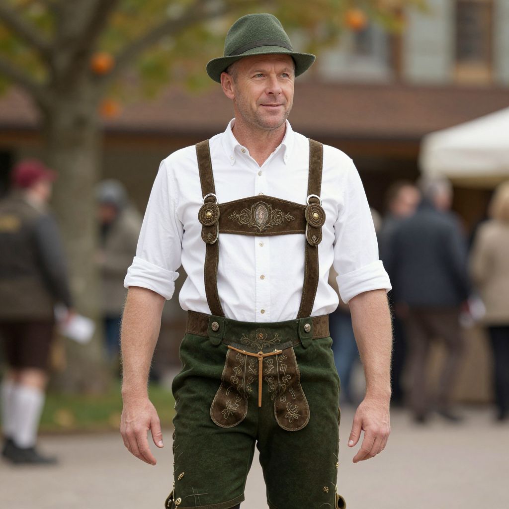 Photograph of a middle-aged white man with a fair complexion, short brown hair, and light stubble, standing outdoors. He wears a green felt Bavarian hat, a white button-up shirt, brown leather suspenders with intricate designs, and dark green lederhosen with a decorative leather apron and belt. His sleeves are rolled up to the elbows. The background shows a blurred, autumnal outdoor scene with people, trees with orange leaves, and a brown building with windows. The man stands confidently, looking slightly to the right with a slight smile. The image has a vibrant, colorful style.