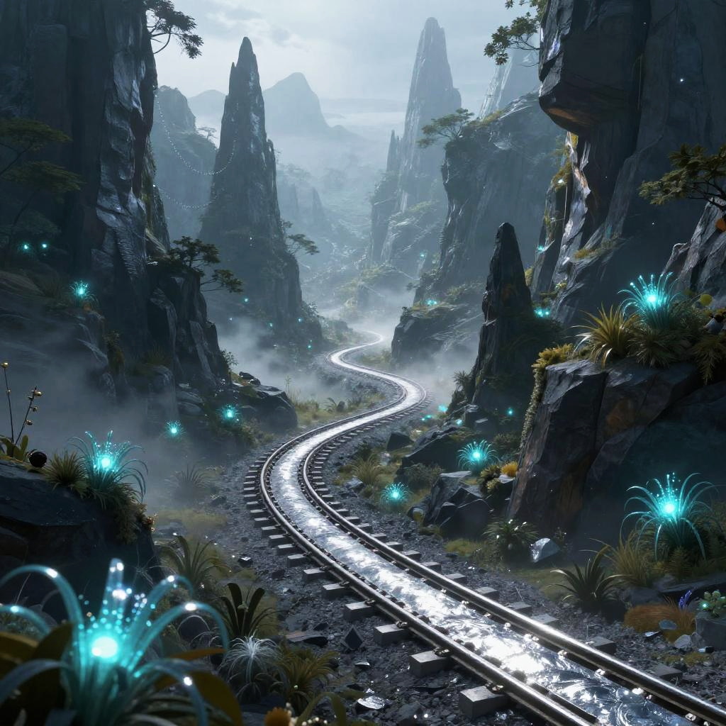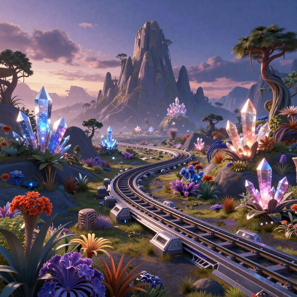 Honkai Star Rail landscape with vibrant alien flora, glowing crystal formations under a twilight sky, futuristic rail tracks weaving through a surreal mountainous terrain, high detail