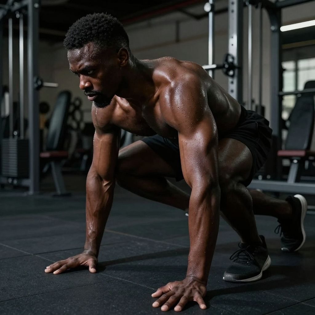 Black muscles in action, dynamic pose mid-workout, detailed sweat and skin texture, urban gym environment, moody lighting with sharp shadows and highlights