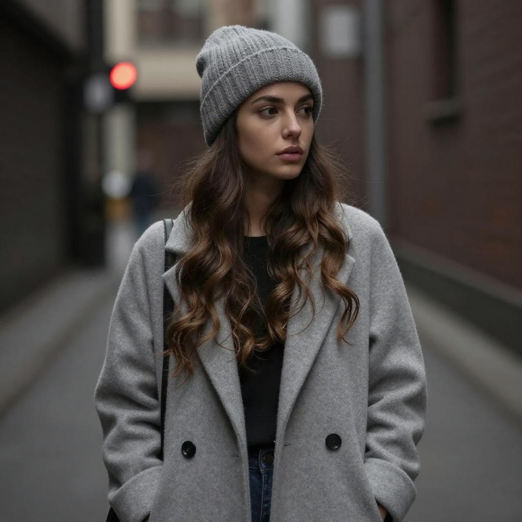Young Woman in Gray Coat and Beanie in Urban Alley