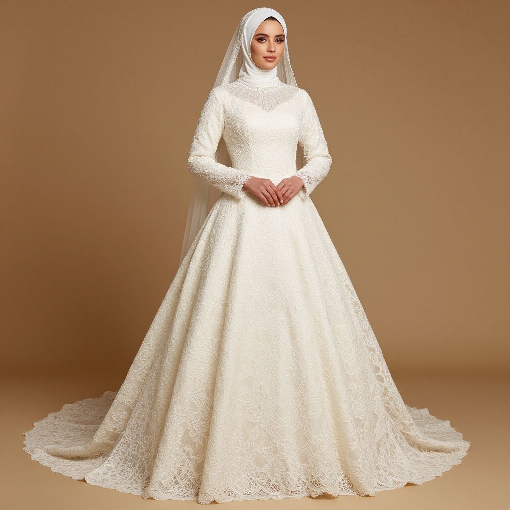 Elegant vintage-inspired Muslim bridal dress featuring a lace ball gown silhouette with long sleeves, a high neckline, and a flowing skirt adorned with intricate lace detailing, complemented by a matching hijab.