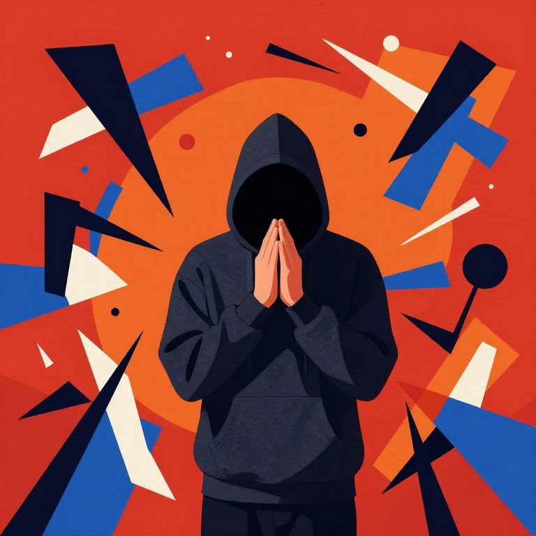 This digital illustration features a person in a black hooded sweatshirt with hands clasped together in front of their face, partially obscuring it. The background is a vibrant, abstract composition with a large, bright orange sun-like shape at the center, surrounded by black, blue, and white geometric shapes, including triangles and circles. The person's figure is centrally positioned, creating a stark contrast against the colorful, chaotic background. The overall style is bold and modern, with a strong use of primary colors and sharp, angular shapes. The person's identity is hidden, adding a sense of mystery.