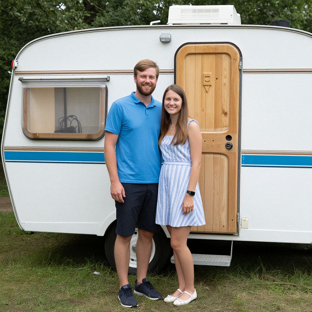 Photograph of a smiling couple standing in front of a white, vintage-style caravan with wooden door and blue stripes. The man, with light brown hair and beard, wears a blue polo and black shorts. The woman, with long brown hair, wears a blue and white striped dress and white flats. They're standing on grass with a tree-filled background.