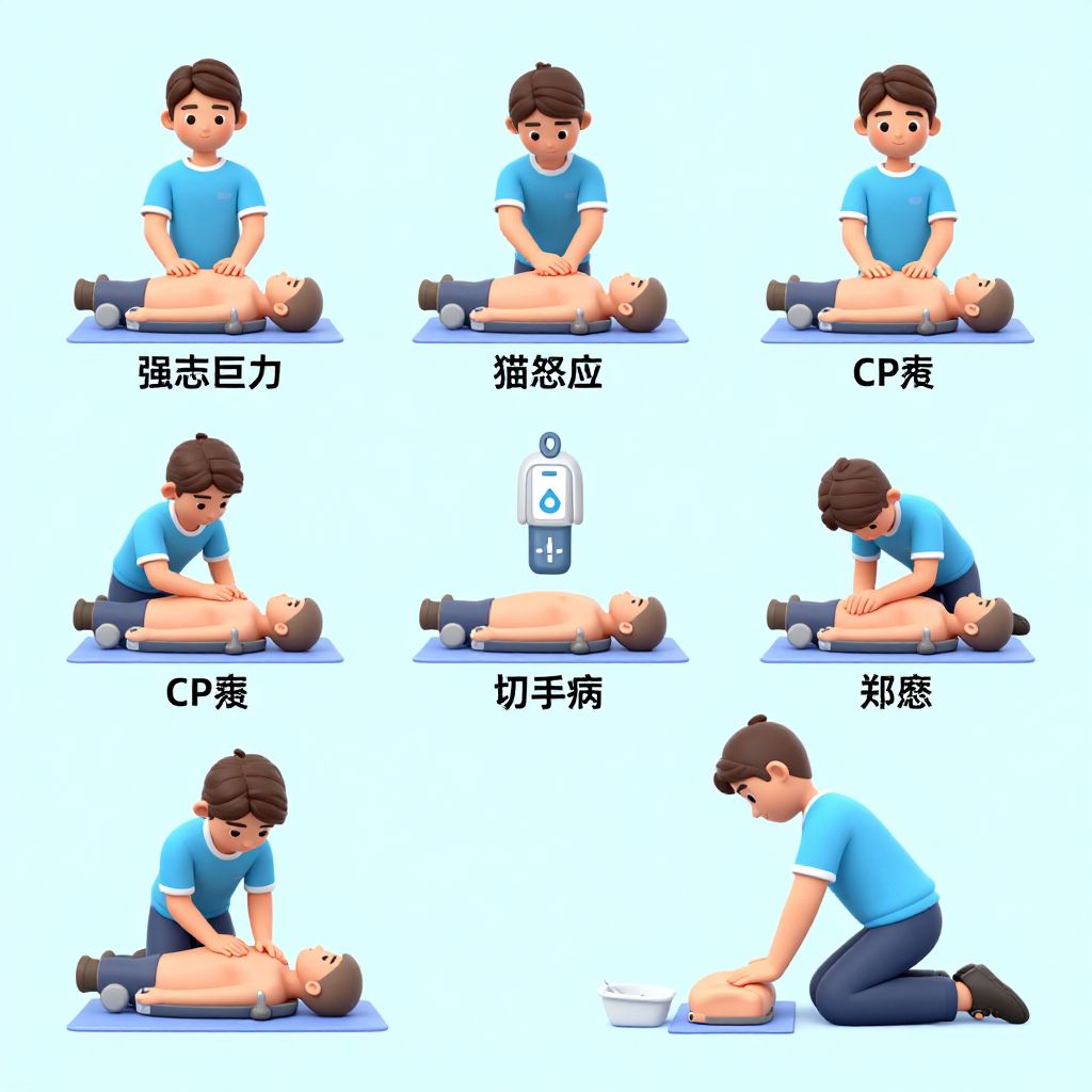 CPR animation in a modern educational style, combining 3D digital character models and simplified backgrounds, showing the sequence of steps from checking responsiveness to calling emergency services and performing CPR.