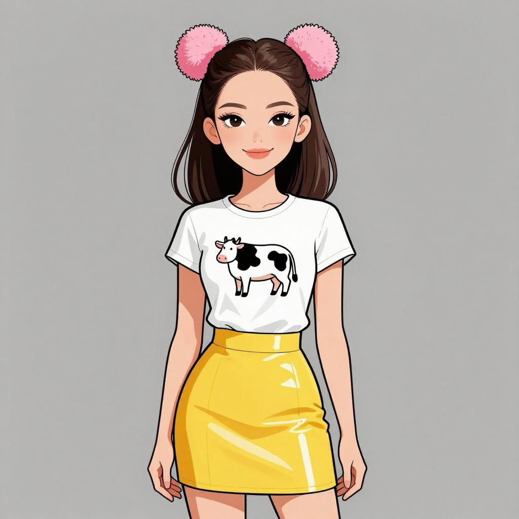 This digital anime-style drawing features a young woman with fair skin and long, straight, dark brown hair. She wears a white, short-sleeve T-shirt with a black and white cow graphic on the chest and a shiny, high-waisted yellow skirt. Her head is adorned with pink, fluffy, pom-pom-like hair accessories. She has large, black eyes and a subtle smile. The background is a solid light gray, making her the focal point. The image uses bold, clean lines and vibrant colors typical of modern anime art.