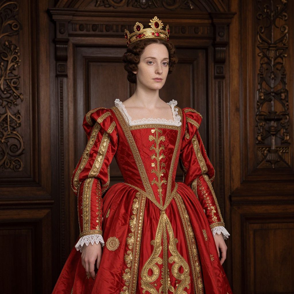 Elegantly poised, a woman dons a richly detailed 16th-century Italian Renaissance costume, featuring a vibrant red gown adorned with gold embroidery, a lace-trimmed neckline, and a golden crown embellished with red jewels, set against an ornate backdrop of dark wood paneling and intricate architectural details.