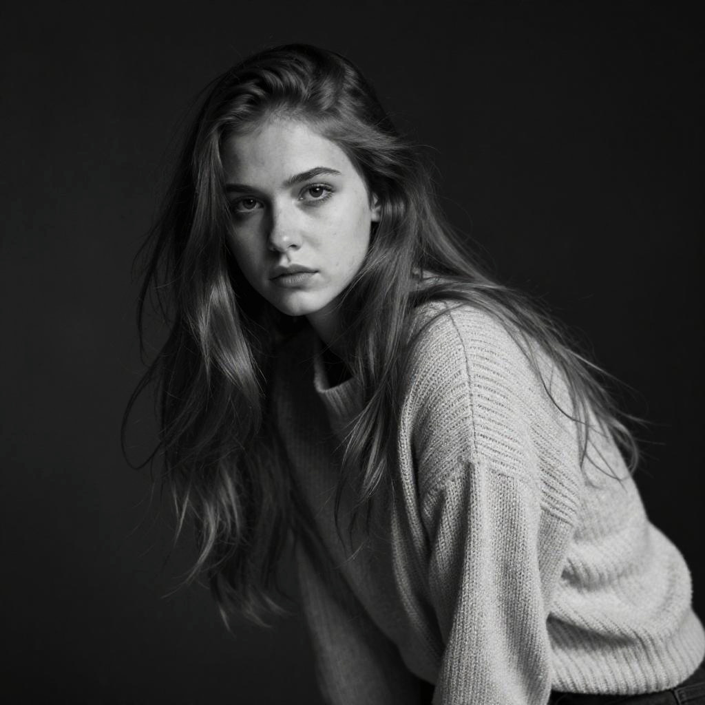 This is a black-and-white photograph of a young woman with long, flowing hair and pale skin. She has a serious expression and is slightly leaning forward. She's wearing a textured, loose-fitting sweater. The background is dark and blurred, making her the focal point. The overall mood is moody and intense, with dramatic lighting highlighting her face.