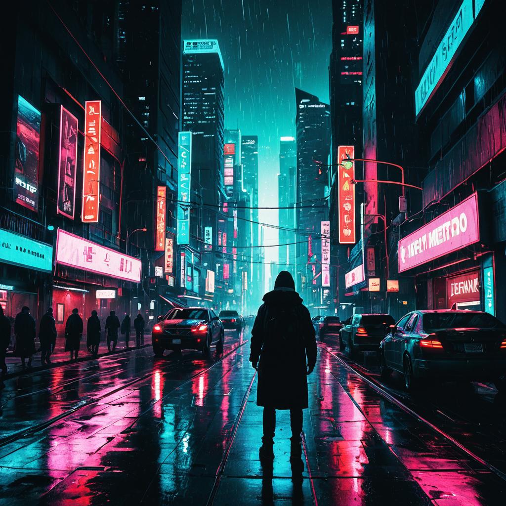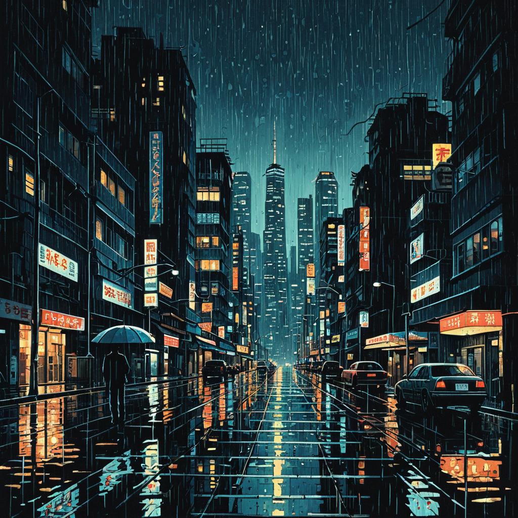 Contrast Travis Bickle from Taxi Driver played by Robert De Niro in the futuristic sci-fi world of Ghost in the Shell, extremely cinematic, orange tint, evening, moody, heavy rain, rainfall, wet, film still, movie scene, photo realistic, detailed photography, human, hyperrealistic, cityscape, 16k, volumetric lighting, ray tracing, unreal engine