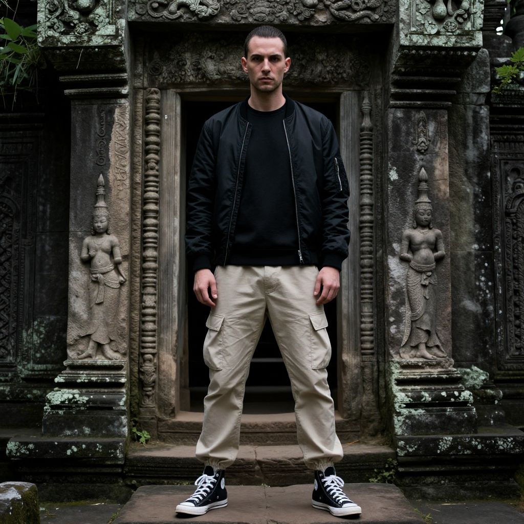 "a man, black crewneck sweatshirt, beige cargo pants, high-top black canvas sneakers, fitted black bomber jacket, monochrome palette, ancient stone temple, intricate carvings, surrounded by lush greenery, Gottfried Helnwein style, dramatic lighting, moody atmosphere.Man has masculine face and piercing eyes"