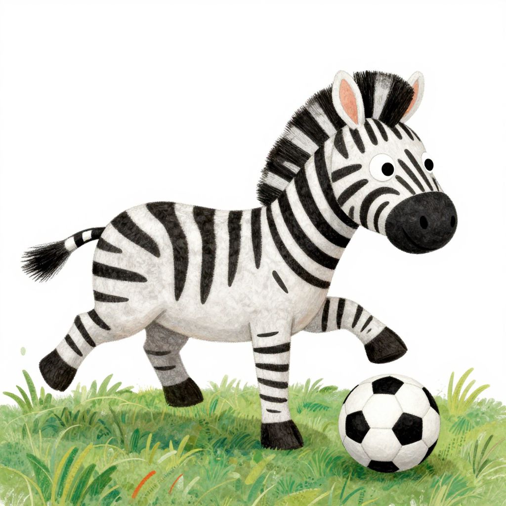 This digital illustration features a cartoon zebra with black and white stripes, standing on green grass. The zebra has a black mane and tail, and is playfully holding a black and white soccer ball in its mouth. The zebra's eyes are large and expressive, and its legs are slightly bent, giving a sense of movement. The background is entirely white, making the zebra and grass stand out prominently. The grass has a textured appearance with varying shades of green, adding a touch of realism to the otherwise whimsical and playful image.