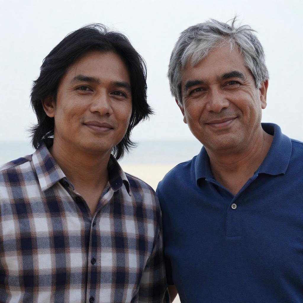 Photograph of two men standing close together. The man on the left has long, dark hair, olive skin, and wears a plaid shirt. The man on the right has short, gray hair, light skin, and wears a blue shirt, smiling. Background is blurred with bright light.