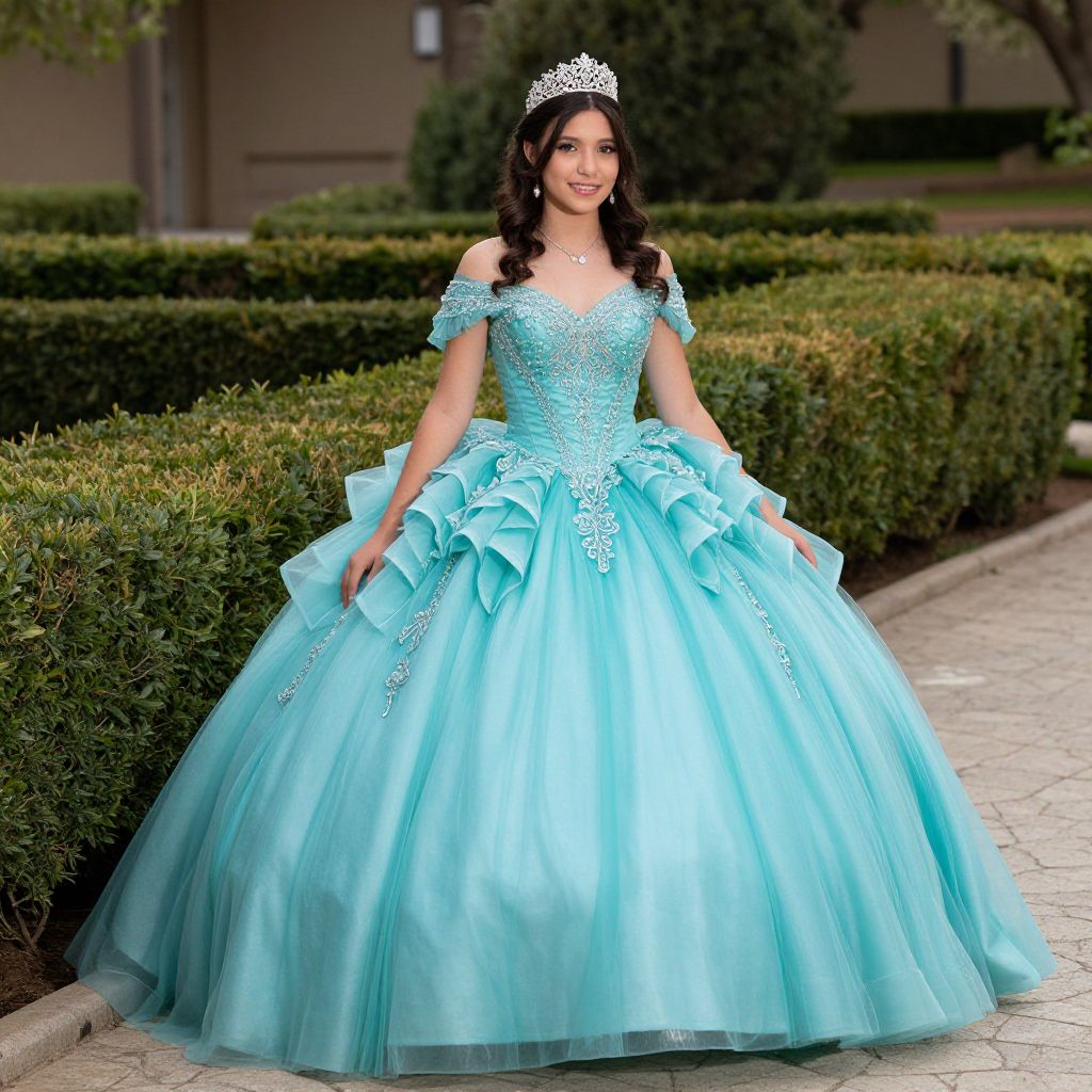Photograph of a young woman with long, wavy black hair, wearing a light turquoise, off-the-shoulder, ball gown with a voluminous skirt adorned with sparkling sequins and ruffles. She also wears a silver tiara and a subtle necklace. Her skin is light brown, and she has a slight smile. The background features neatly trimmed green hedges and a stone pathway, with a brown building partially visible in the distance. The image is brightly lit, emphasizing the vibrant color of the gown and the lush greenery.