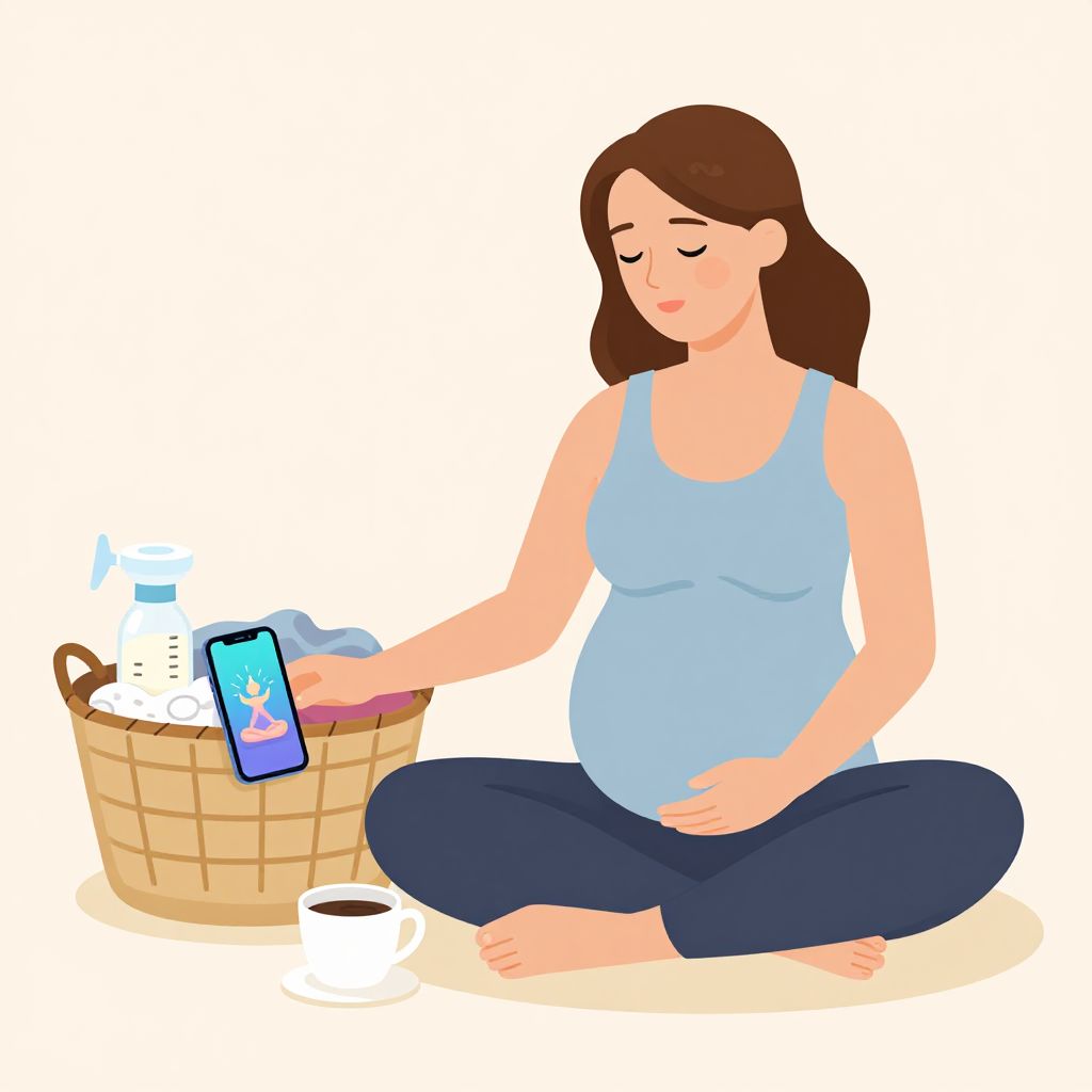 Digital illustration of a pregnant woman with light skin and brown hair, sitting cross-legged on the floor. She wears a light blue sleeveless top and dark blue pants. Her eyes are closed, and she has a calm expression. Her left hand rests on her large, round belly, while her right hand holds a smartphone displaying a baby's face with a blue background and white icons. Beside her is a wicker basket containing a white cloth and a brown handle. A white mug is on the floor in front of her. The background is plain white.
