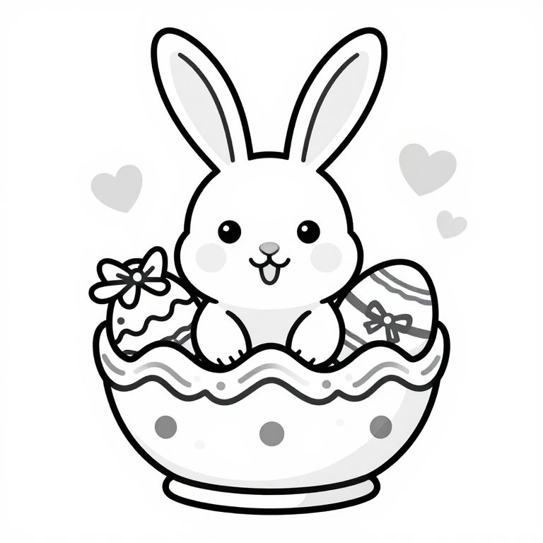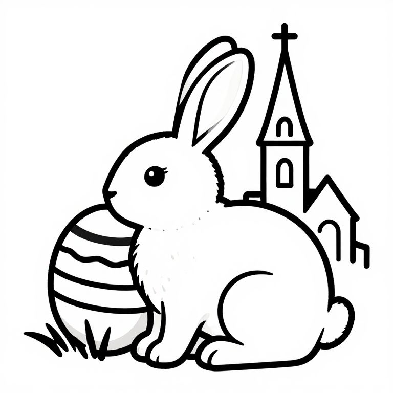 Crinkled vector black and white coloring book style bold lines, the background is white :: easter bunny and church :: high contrast,