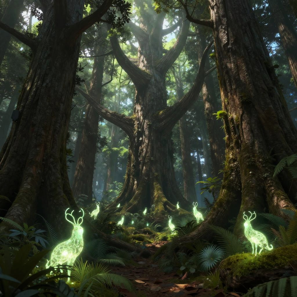 Smedan ancient forest with mystical glowing flora and fauna, massive trees with textured bark, soft rays of light filtering through dense canopy, enchanted atmosphere, detailed nature elements, fantasy art style