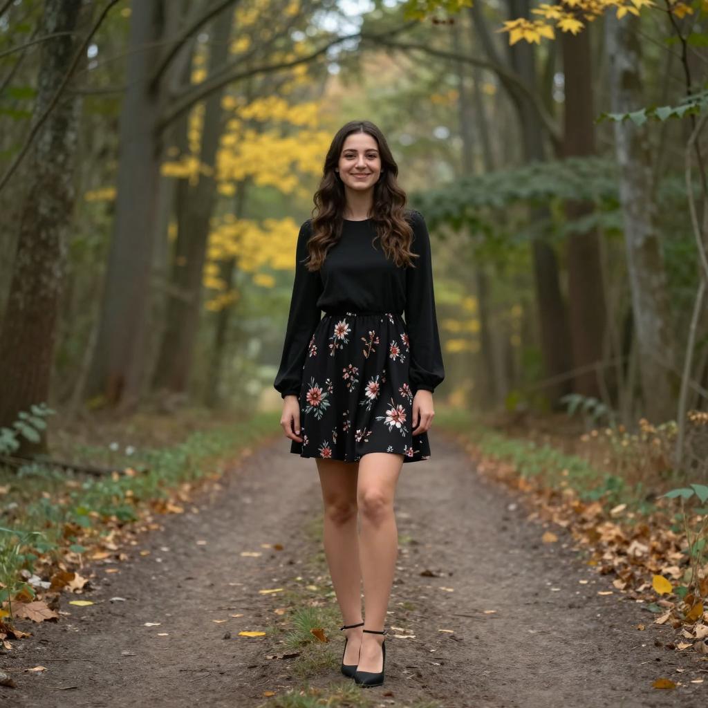 Long sleeve black birthday, photograph of a young woman standing on a forest path, wearing a black floral dress with long sleeves and a slightly flared skirt, black high heels, long wavy brown hair, smiling, surrounded by tall trees, green foliage on both sides, yellow leaves in the background, fallen leaves on the path, overcast lighting, autumn setting, natural light, full body shot, realistic style, portrait orientation, serene and calm atmosphere, casual and elegant fashion.