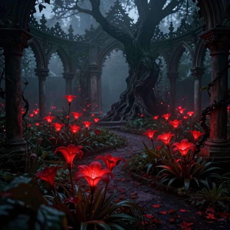 The image depicts a gothic garden scenery, bathed in a mysterious, dark ambiance. The scene is dominated by vibrant red bioluminescent flowers that glow with an eerie, ethereal light, creating a striking contrast against the gloomy, foggy atmosphere. The garden is adorned with intricate, ornate architecture, including archways and columns, which are partially obscured by the dense foliage and the mist. A large, twisted tree trunk stands prominently in the center, adding to the mystical and eerie feel of the scene. The overall composition is balanced, with the flowers and architectural elements arranged in a harmonious yet slightly unsettling manner, evoking a sense of both beauty and foreboding. The interplay of colors, textures, and shapes creates a rich, immersive visual experience that invites the viewer to explore the depths of this enigmatic garden.