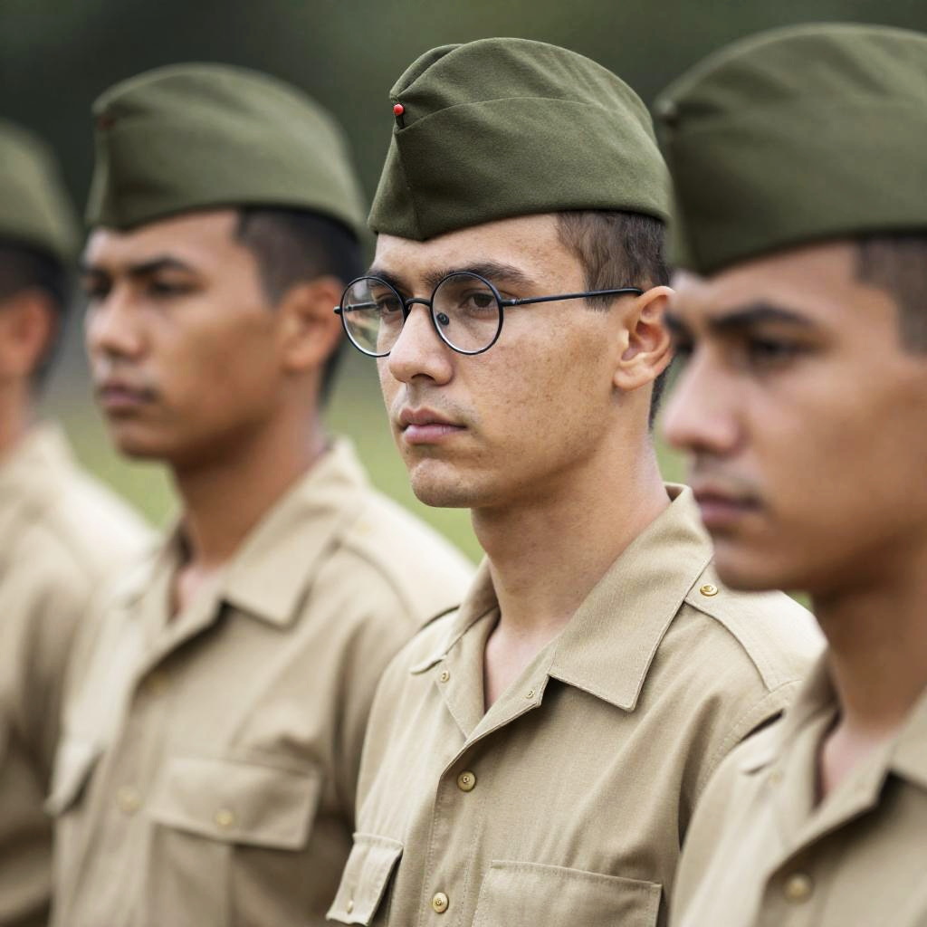 Photograph of four young men in military uniforms standing together, smiling. Three hold white military hats. One wears a naval cap. American flag and another flag in background. All have arms around each other. Flags to the left.