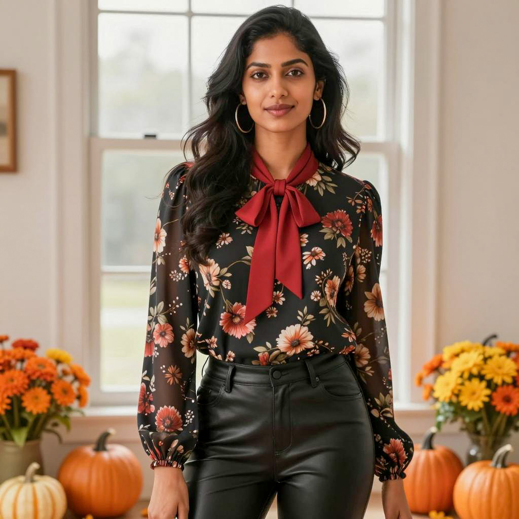 Thanksgiving eve outfit, photorealistic, female, Indian, long wavy black hair, medium skin tone, wearing floral patterned black long-sleeve top, red tie-knot, black leather pants, large hoop earrings, standing in sunlit room, autumn/halloween decorations, pumpkins, orange and yellow flowers, window in background, soft natural light, casual outfit, slight smile, realistic ures, detailed clothing, indoor setting, model looking at camera, relaxed pose
