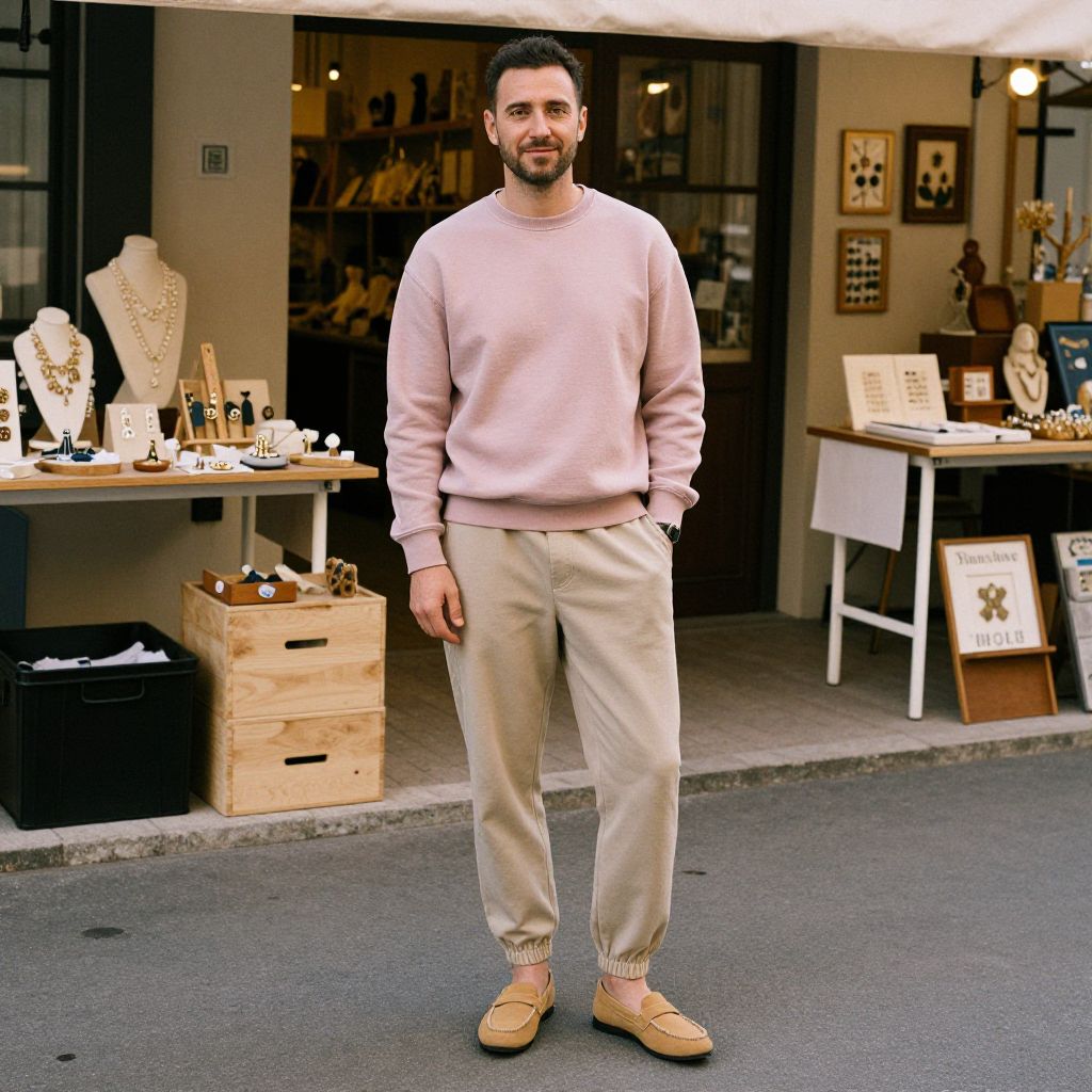 A man, beige joggers, relaxed fit, pastel crew neck sweatshirt, minimalist tan loafers, artisan booths, handmade crafts, warm evening glow, oversaturated film style, relaxed smile. Man has masculine face and piercing eyes