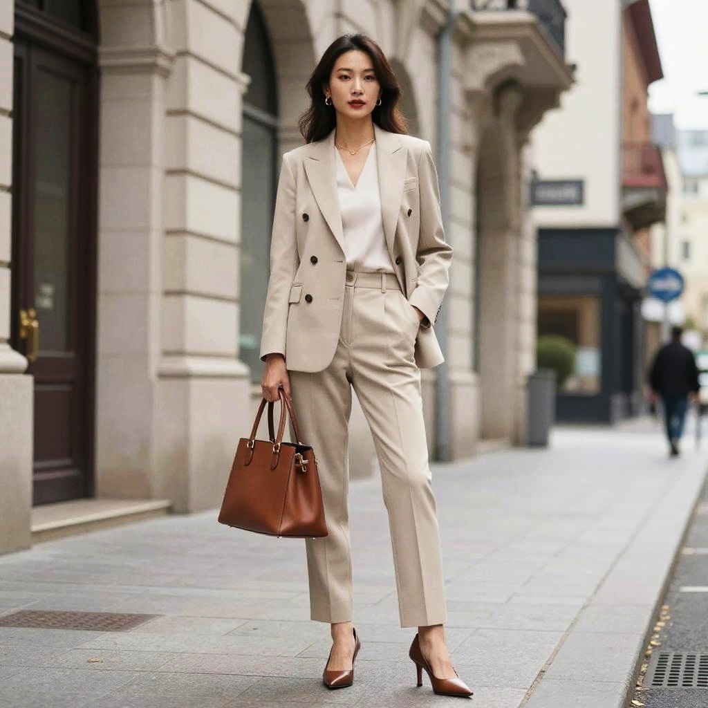 A woman dressed in a stylish beige suit stands confidently on a city street, holding a brown handbag. The architectural backdrop features classic European design, enhancing the professional and sophisticated ambiance of the scene.