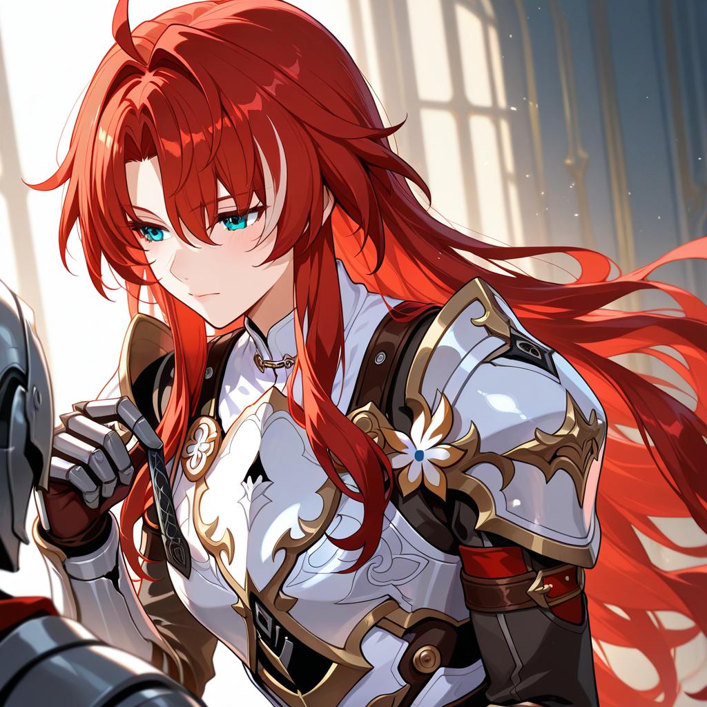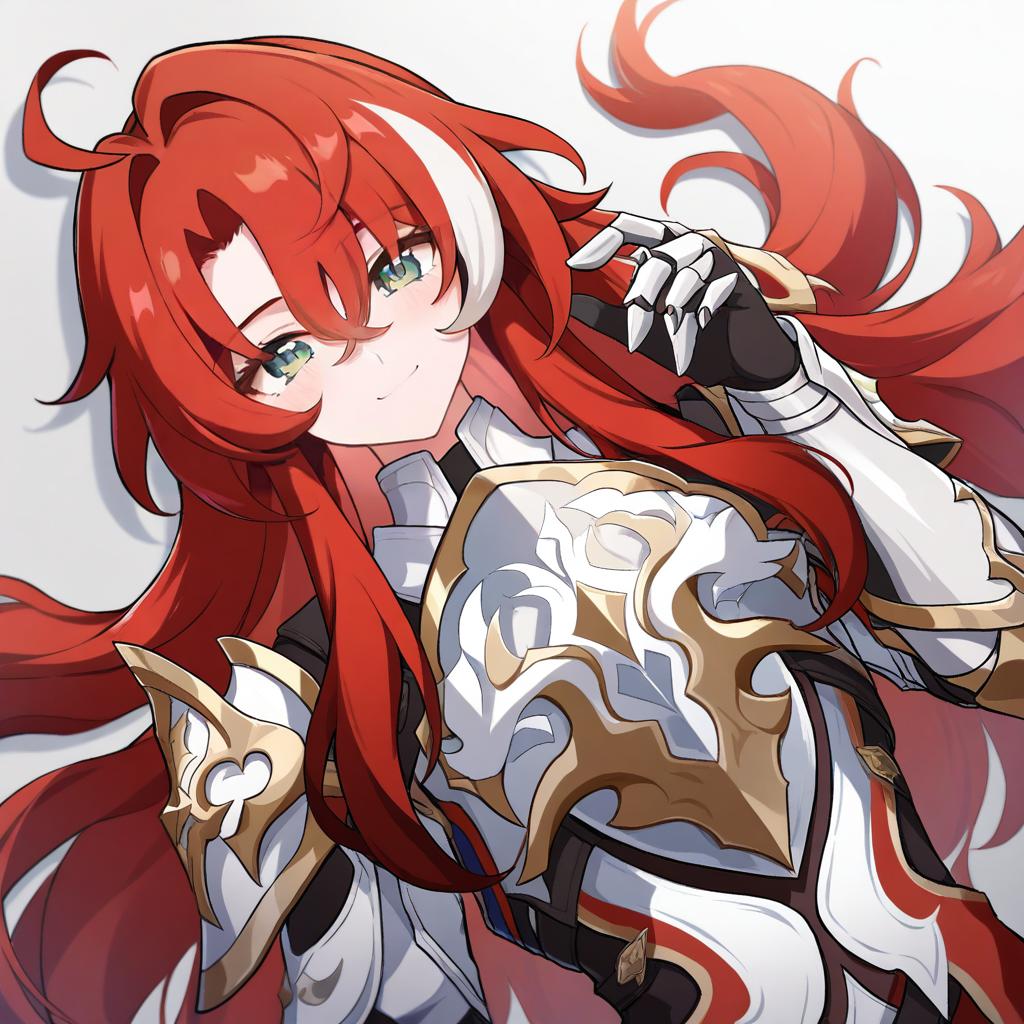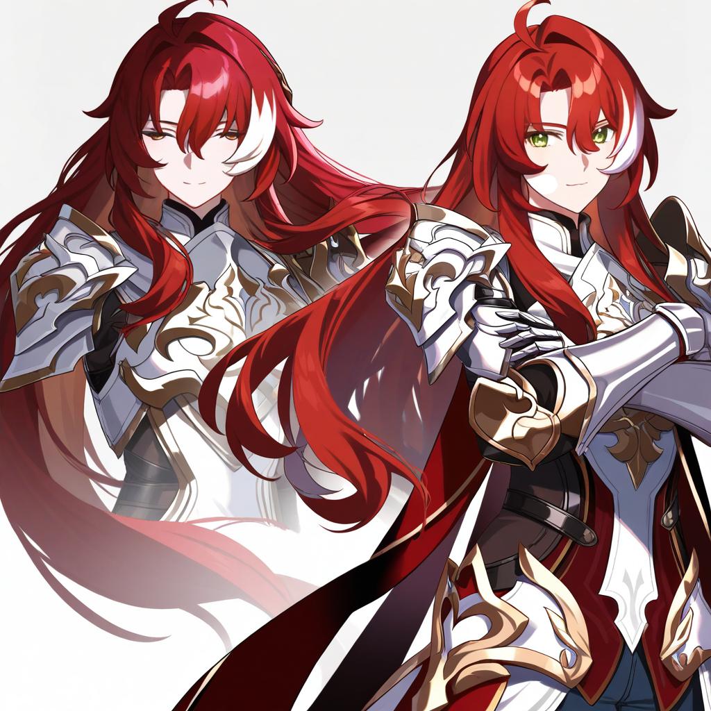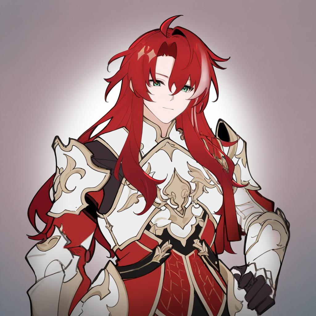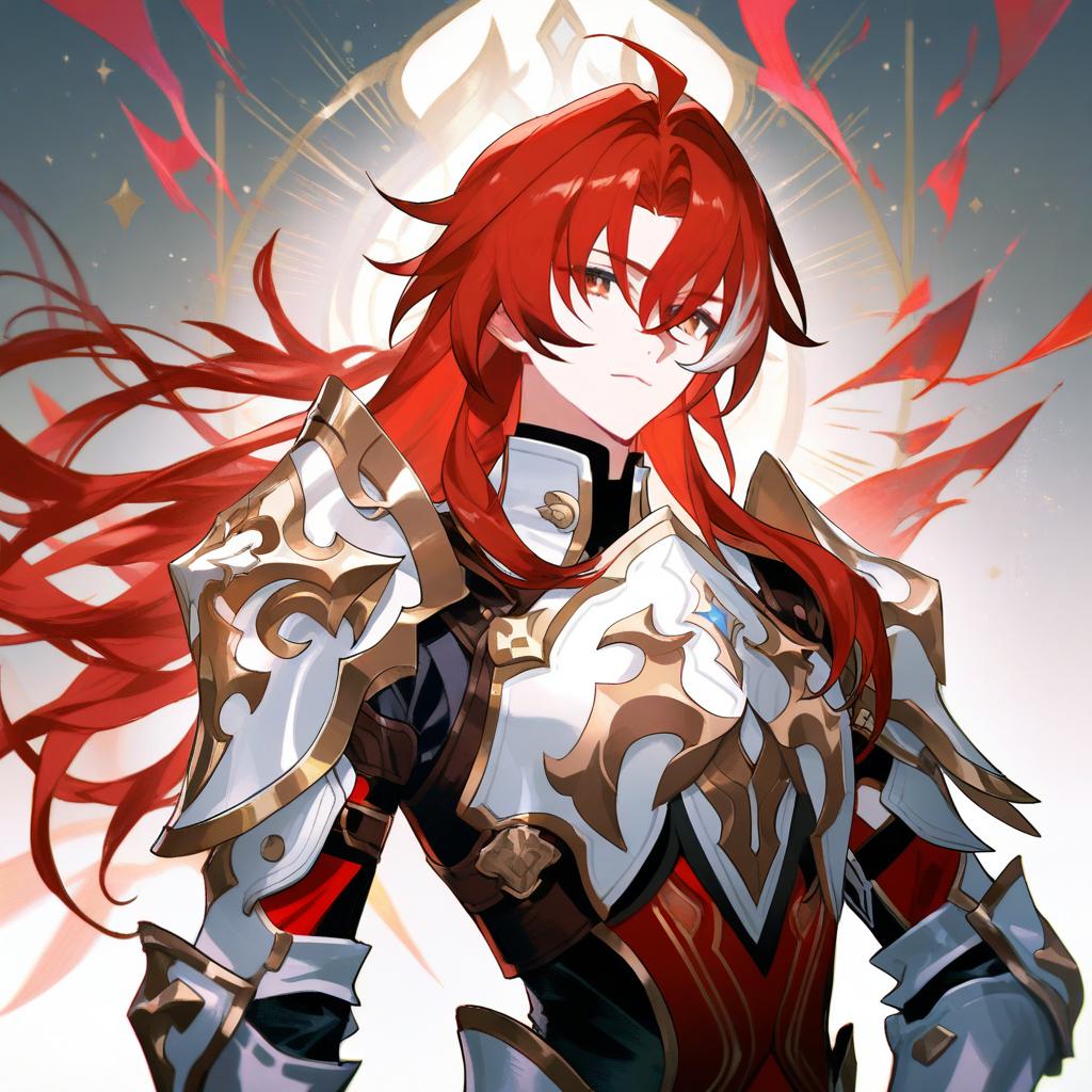 Argenti (honkai: star rail), honkai: star rail, 1boy, green eyes, hair between eyes, red hair, long hair, curtained hair, streaked hair, ahoge, parted bangs, white armor, knight, gauntlets, knight, pauldrons, breastplate, by artist shirogane hina, illustrious
