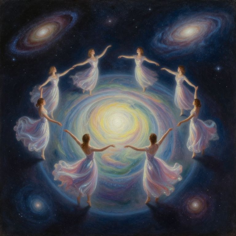 Digital painting of seven ethereal, white-gowned women dancing in a circle around a glowing, colorful galaxy with two spiral galaxies in the background, set