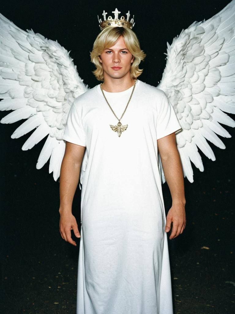 Portrait of a young blonde man wearing a white angel costume with large white wings and a golden crown. He is dressed in a long white garment and a necklace with a winged pendant, standing against a dark background.