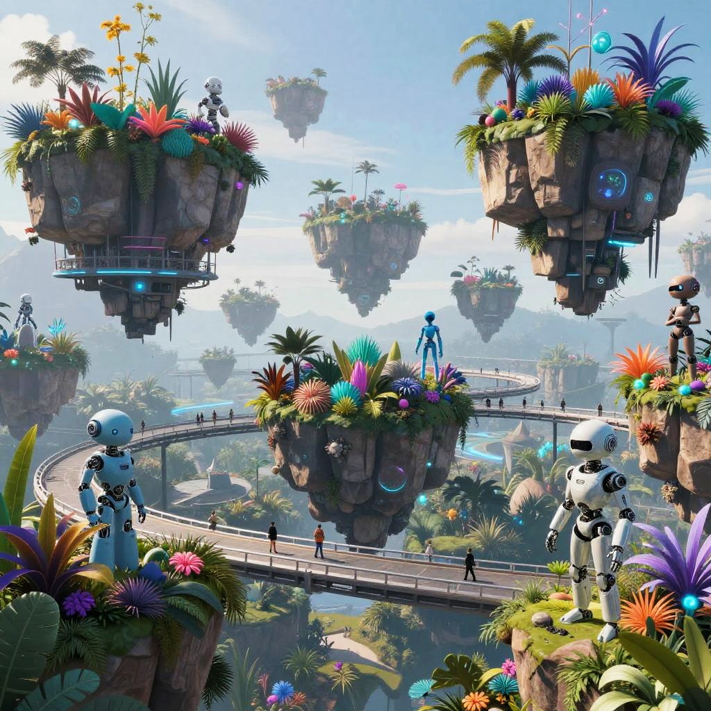 Zenless intricate digital landscape featuring floating islands covered with neon foliage, interconnected by glowing bridges, inhabited by robotic creatures and humans in harmonious coexistence, radiating a sense of otherworldly calm and technological wonder.