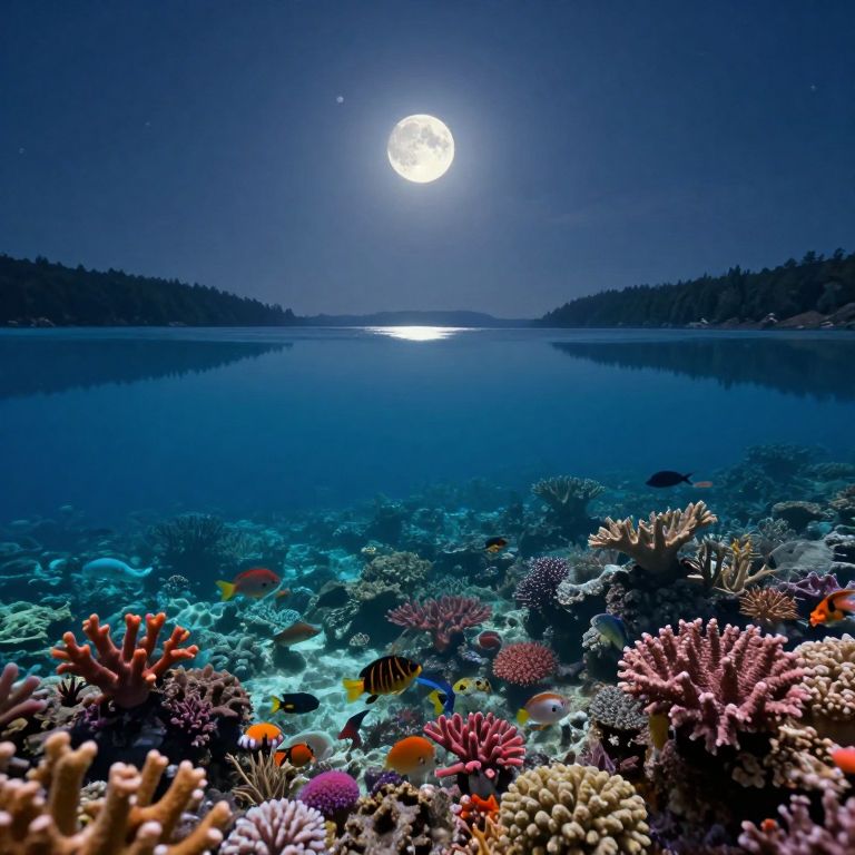 A mesmerizing fusion of contrasting natural environments, this surreal artwork captures the breathtaking beauty and interconnectedness of underwater marine life and a tranquil desert landscape under a starlit sky. The scene seamlessly transitions from the vivid colors of a coral reef teeming with vibrant flora and fauna to the earthy hues of arid dunes, all bathed in the gentle light of a crescent moon. This innovative aerial perspective showcases nature's harmony, as shadows dance across the unified visual canvas, creating an atmosphere of serenity and wonder in this harmonious blend of contrasting ecosystems.