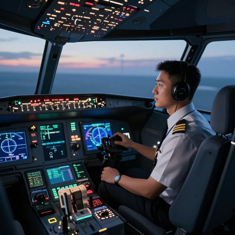 Trainee pilot in a flight simulator cockpit, surrounded by complex controls and screens, focused expression, twilight outside the window, atmospheric lighting, cinematic digital art with a sleek futuristic vibe