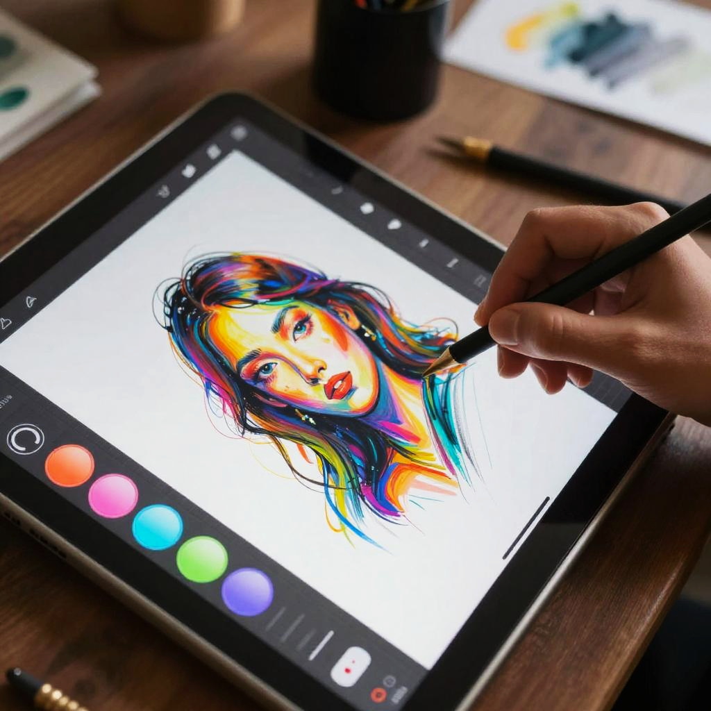 Close-up of an AI drawing app on a touchscreen device showing dynamic brush strokes being created, vibrant color palette, futuristic UI elements with holographic buttons and sliders, creative artist studio background, detailed digital artwork in progress