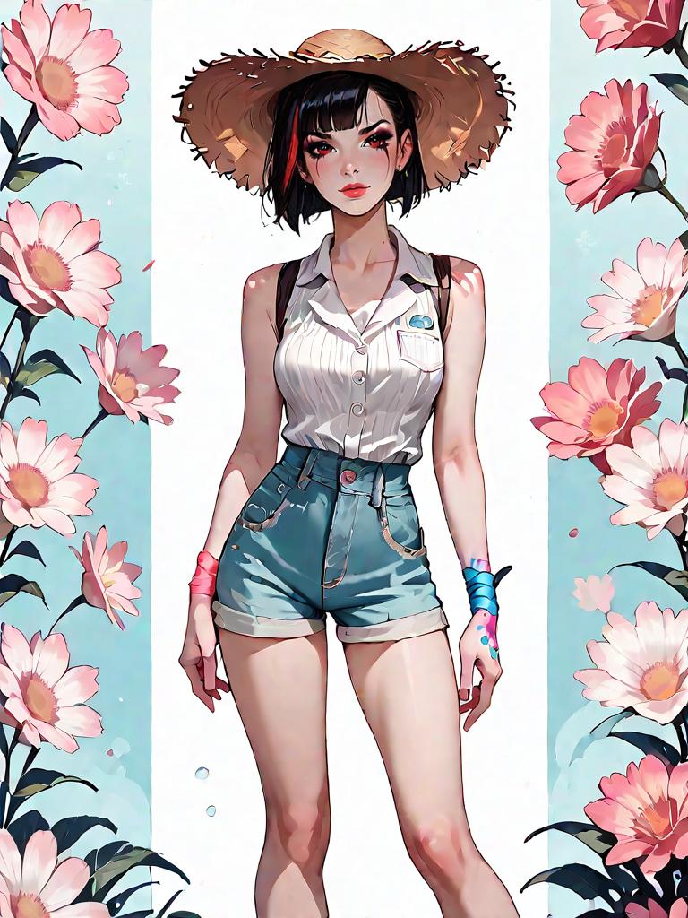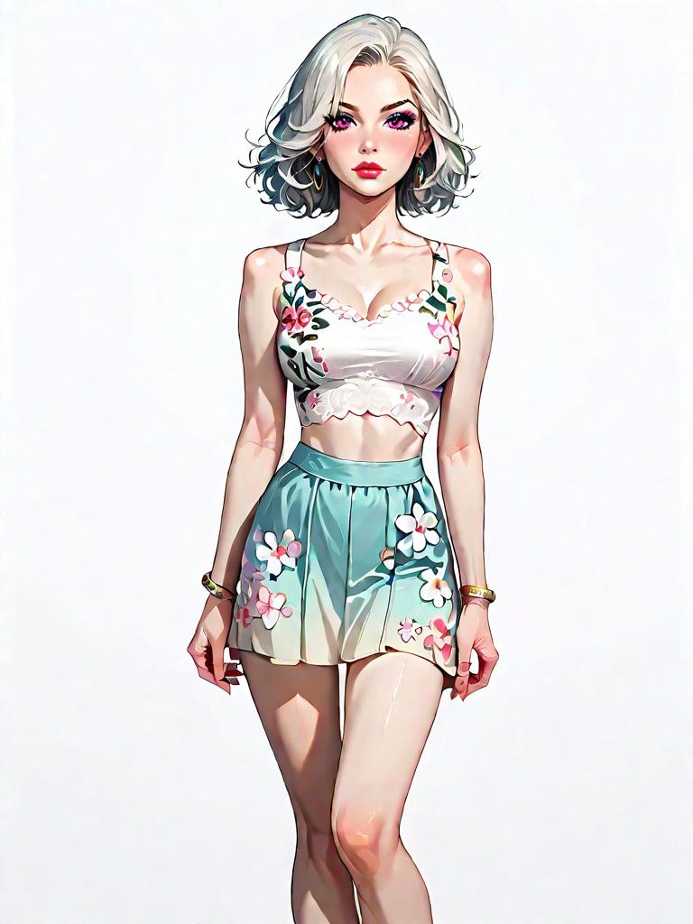 1girl, source_comics, realistic face, full body shot, Woman, chic, red scalloped neckline tank top, fitted, spaghetti straps, floral printed A-line skirt in a satin finish, knee-length, pleated detail, paired with a light pink structured handbag with a clasp.