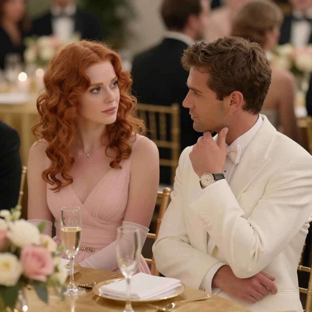 Photograph of four people in formal attire on a grand staircase. Two men in black tuxedos and two women in elegant dresses. Women have red hair, one with elaborate updo, other with curly. One woman wears white gloves. Ornate wooden railing, decorative stairs. Men stand on left and right, women in center. All looking at each other, smiling. Warm, golden lighting.