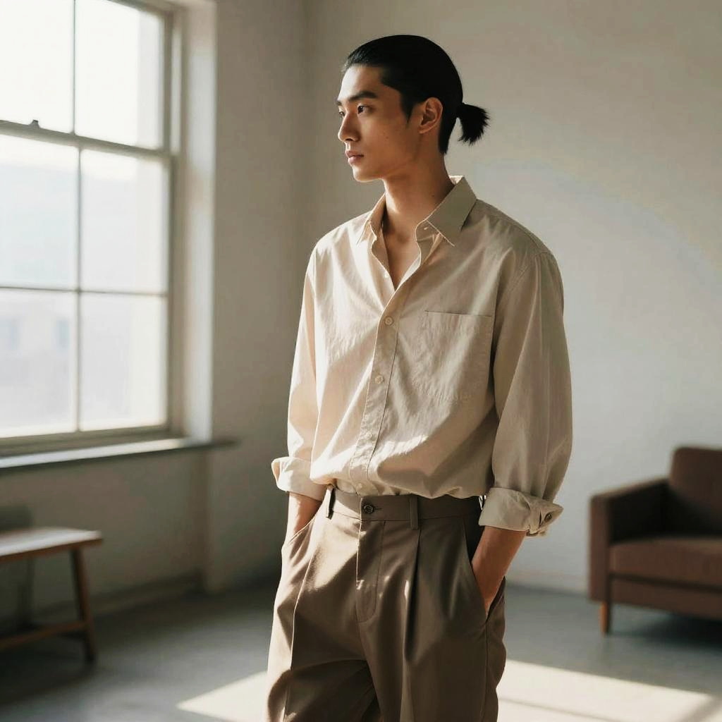 Sleek Ponytail hairstyle on senior model, wearing elegant wool coat, in historic library, captured in fashion editorial style with soft indoor lighting.