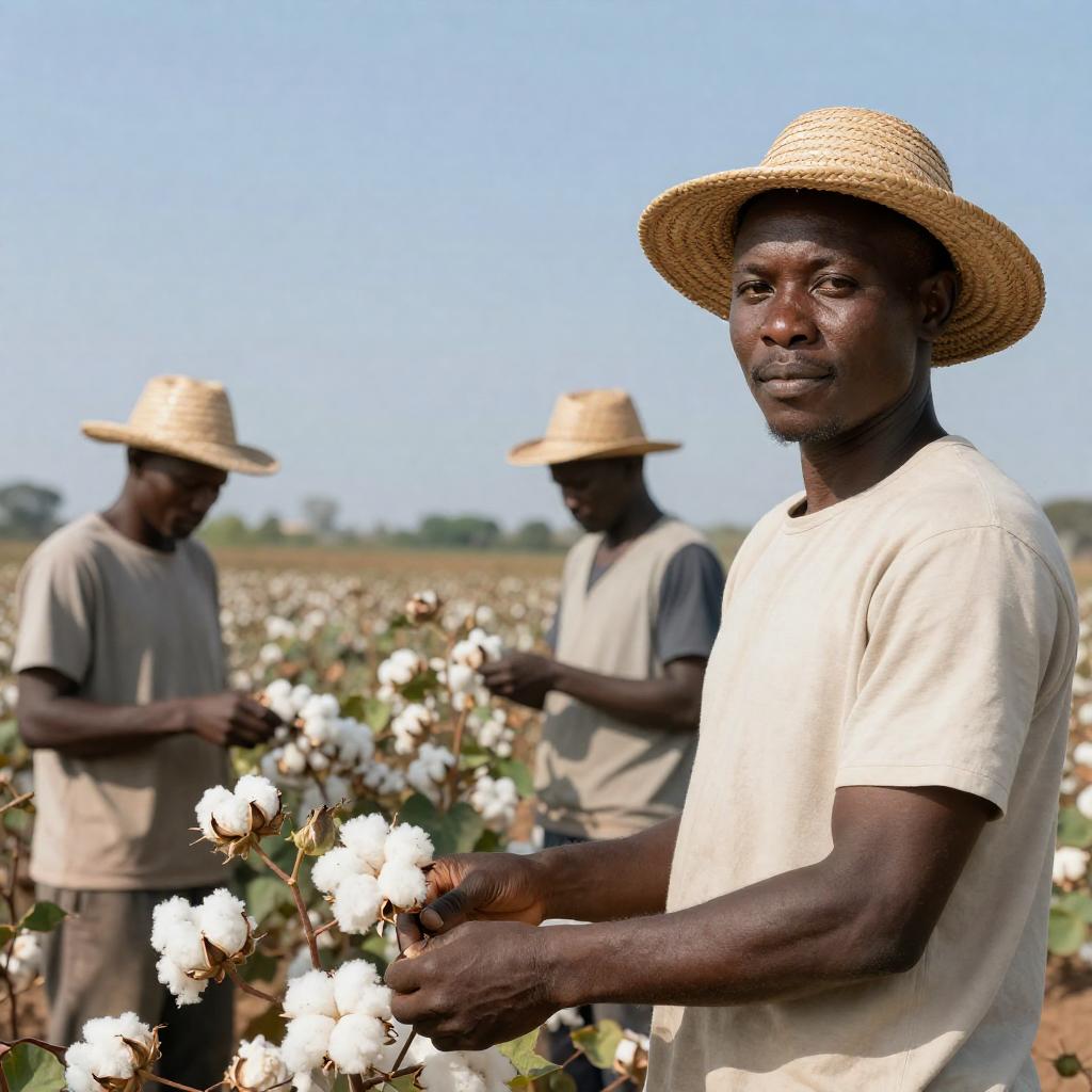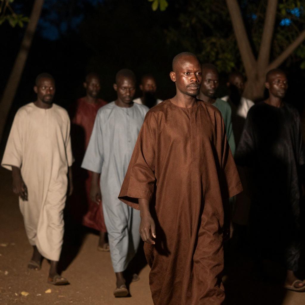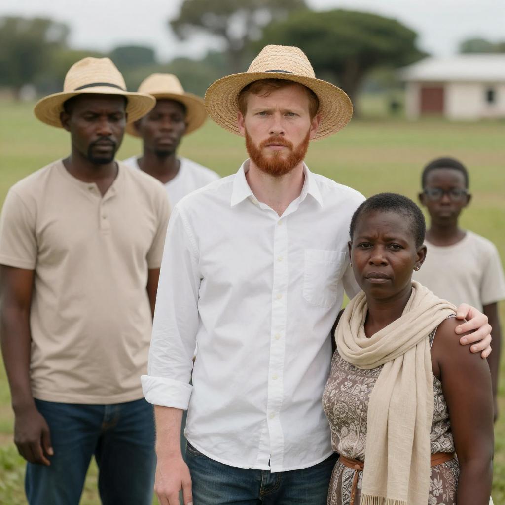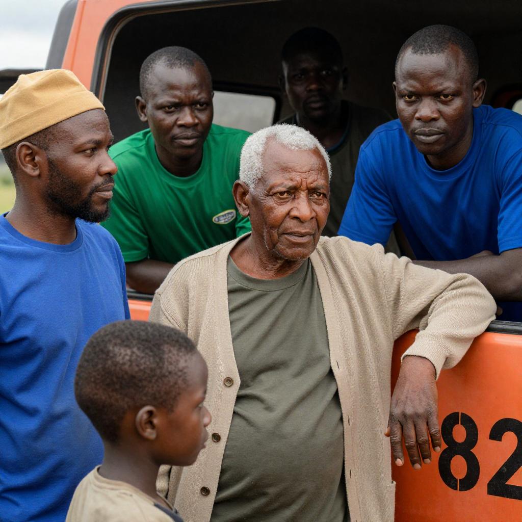 Photograph of eight African men standing in a cornfield. They wear beige, brown, and white loose-fitting clothes with straw hats. Most have short black hair and wear copper necklaces. Central man stands slightly forward, looking serious. Surrounding men have neutral expressions. Tall green corn stalks in background. Central boy in front looks solemn. Men wear varied expressions of seriousness and calm.