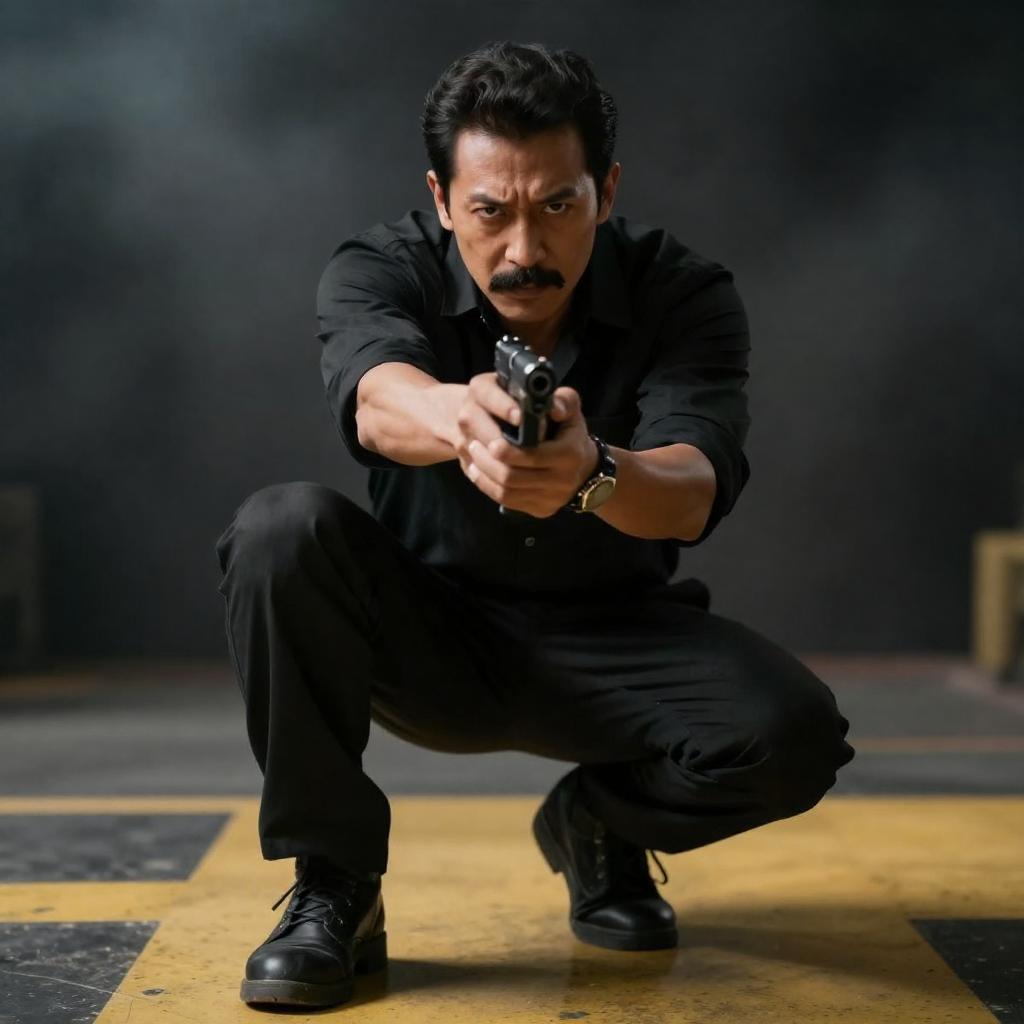 Photograph of a middle-aged man with a mustache, crouching low, holding a gun in his right hand, and pointing with his left. He wears a black shirt and pants, against a dark, smoky background. He has a focused expression. The ground has a yellow and black pattern. The man is centered, with the gun and pointing hand in front. Number of people: 1.