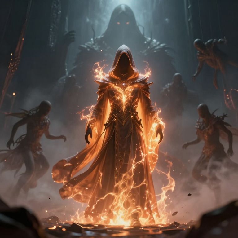 In this futuristic space mage concept art by Piotr Jabłoński, a central figure stands resolute, cloaked in a flowing, hooded robe that glows with an ethereal, fiery aura. The mage's face is obscured by a dark, hooded cloak, adding an air of mystery and intrigue. Surrounding the mage are misty, ghostly figures, their forms blurred and indistinct, creating a sense of depth and atmosphere. These spectral beings are scattered around the mage, some appearing to float or hover, while others seem to be in motion, adding a dynamic element to the scene. The background is a mix of dark, smoky hues, with a large, ominous figure looming in the distance, its glowing eyes piercing through the mist. The overall composition is balanced, with the mage at the center, the ghostly figures encircling him, and the dark, smoky background providing a stark contrast. The interplay of light and shadow, along with the intricate details of the mage's robe and the ghostly figures, creates a visually captivating and immersive scene.