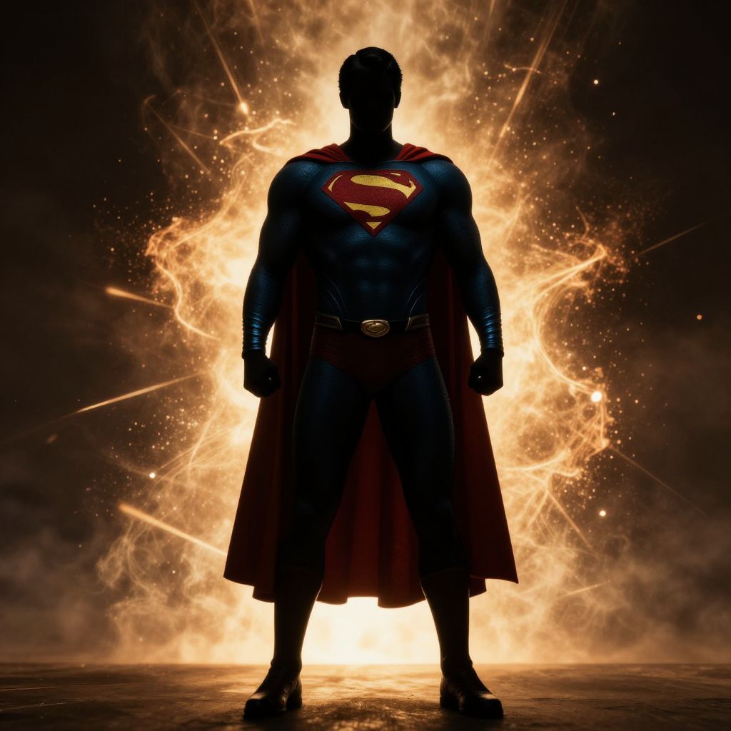 Silhouette #character Tamil Superman, full costumes, photorealistic, movie camera, cinematic, light effects, particle effects, rich details, 8k,