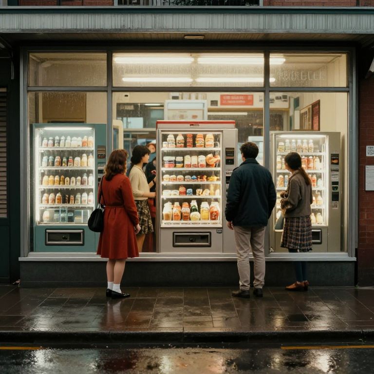 Retro automat scene on a rainy day with vintage glass-front vending windows, people in mid-century outfits selecting classic diner meals, detailed reflections on wet pavement, muted color tones evoking nostalgic Americana and quiet urban life