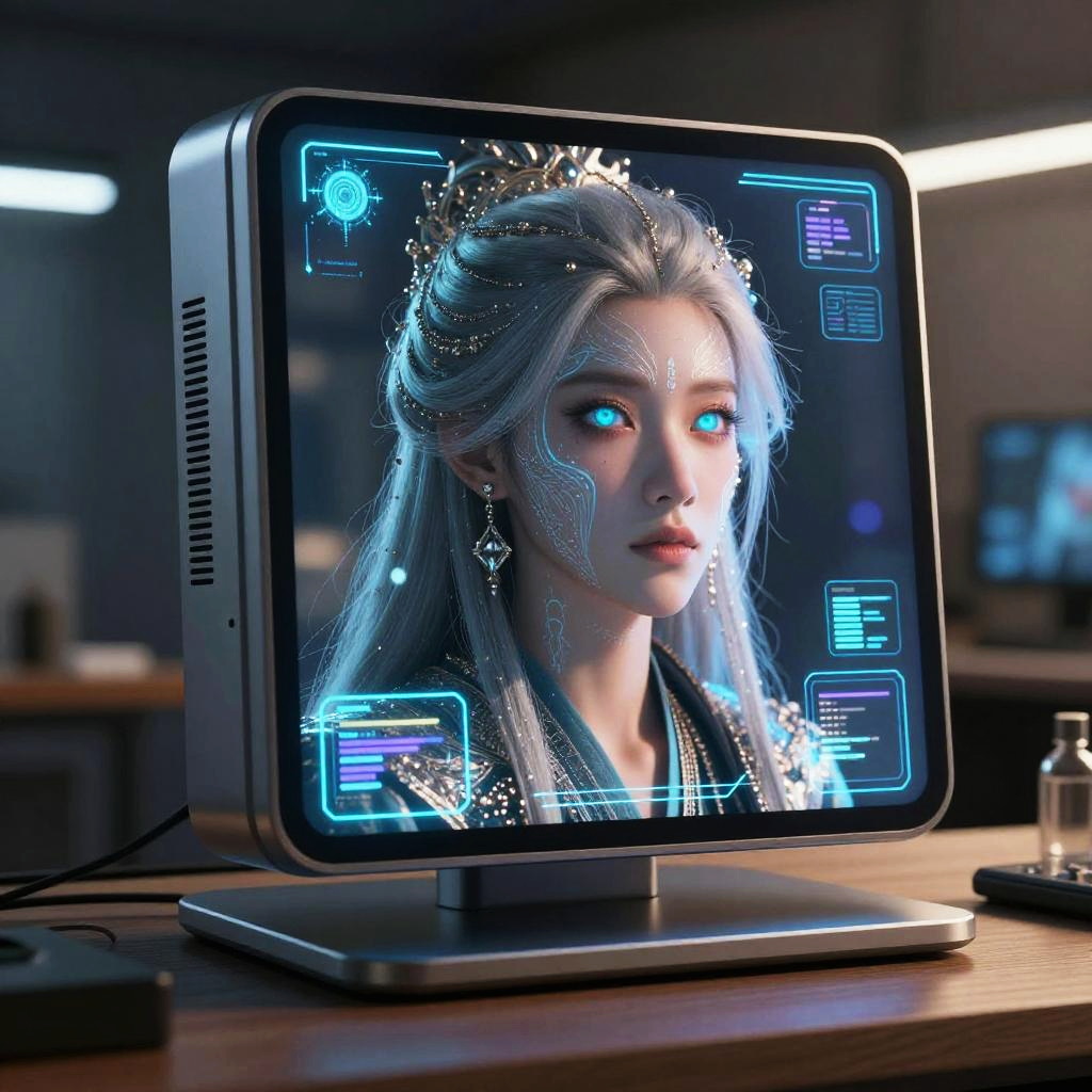 AI character portrait generator free scene, a digital workspace filled with holographic portraits created by AI, blending fantasy and sci-fi themes, glowing interfaces, detailed expressions and textures, modern and futuristic design, ultra-realistic rendering, colorful and vivid