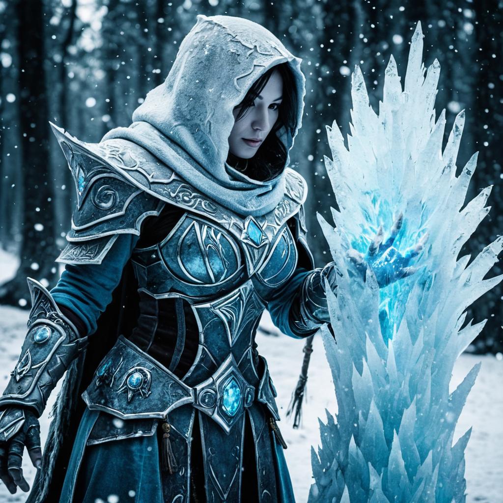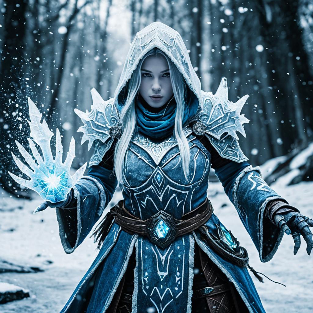 Portrait of a female frost mage with silver hair and pointed elf ears, wearing detailed blue and silver armor adorned with glowing blue crystals, casting powerful frost magic with an ice formation in her hand. The background features a snowy, forested winter landscape with falling snowflakes.
