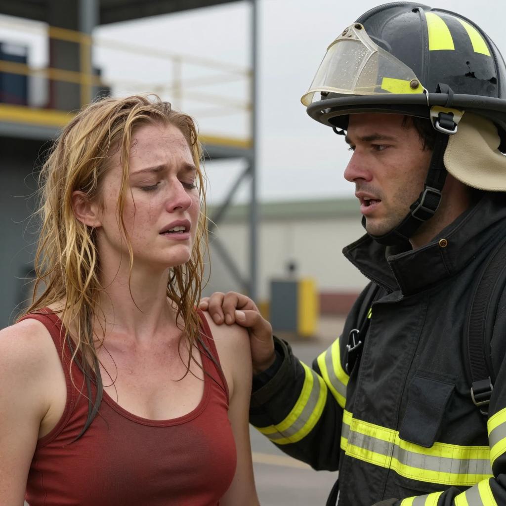 Photograph of a distressed blonde woman and a grinning man, both with dirt-smudged faces. Woman has long hair, eyes closed, mouth open in pain. Man has short, dark hair, clenched teeth, arm around her waist, gripping metal pipe. Background includes dark wooden ure.