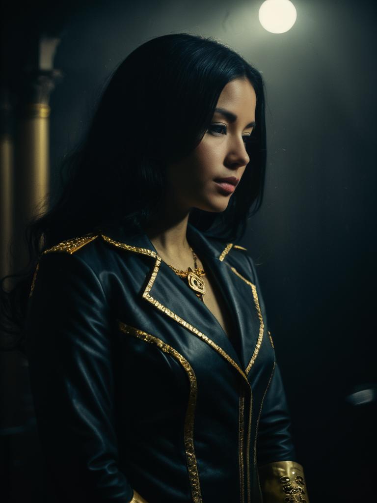 Portrait of a woman dressed in a realistic Marina Ismail cosplay costume with black and gold detailing. The subject has long dark hair and is wearing a black leather jacket adorned with gold trim and accents. The lighting in the image is moody and highlights the detailed costume and the model's profile.