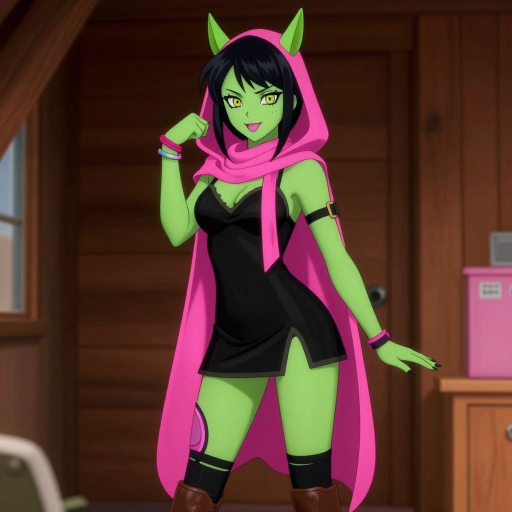 Csm anime style, willowBS, monster girl, green skin, head fins, yellow sclera, black eyes, black hair, short hair, ponytail, pink lips, bracelet, pink scarf, cape, hood, hood up, black dress, short dress, asymmetrical sleeves, socks, asymmetrical legwear, brown boots, a woman in a lingerie sexy pose, Smiling, cinematic shot, Cabin, ├п┬╗┬┐Anaglyph 3d Photography, Modernist Photography