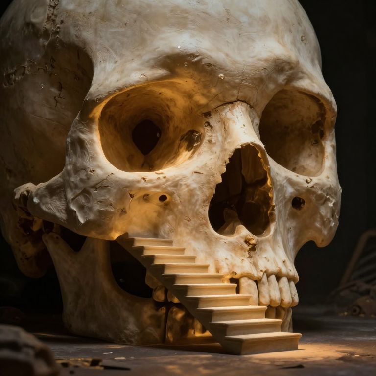 An ethereal staircase ascends through the hollowed core of a colossal, textured skull, casting a warm, inviting glow that beckons toward an unknown destination, evoking a sense of introspection, mystery, and the timeless journey of self-discovery.