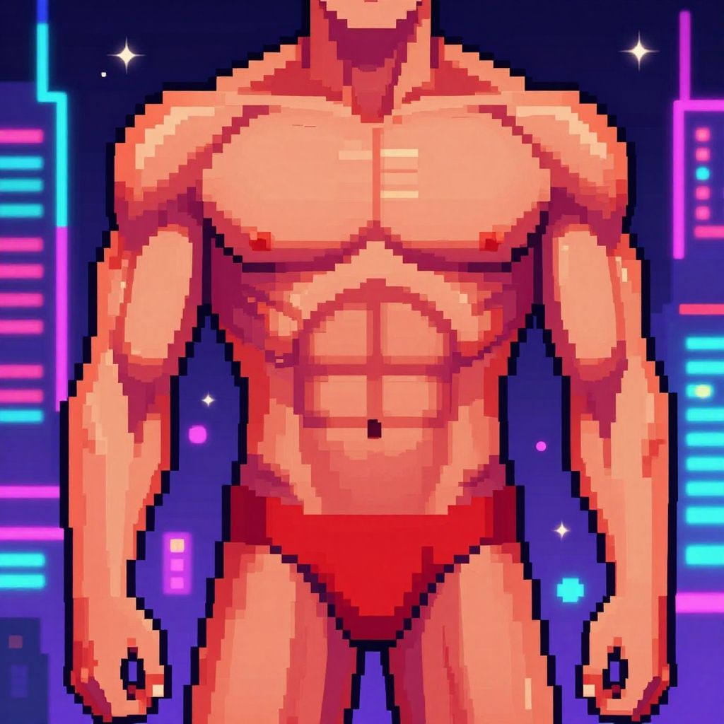Pixel art of a muscular, shirtless man in red briefs, standing against a neon-lit, futuristic cityscape background. Vibrant colors,